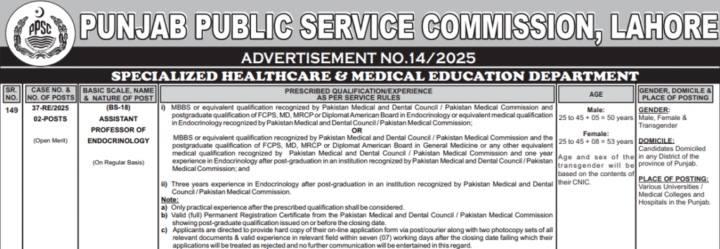 PRESCRIBED QUALIFICATION/EXPERIENCE AS PER SERVICE RULES | i) MBBS or equivalent qualification recognized by Pakistan Medical and Dental Council / Pakistan Medical Commission and postgraduate qualification of FCPS, MD, MRCPor Diplomat American Board in Endocrinology or equivalent medical qualification in Endocrinology recognized by Pakistan Medical and Dental Council / Pakistan Medical Commission; OR MBBS or equivalent qualification recognized by Pakistan Medical and Dental Council / Pakistan Medical Commission and the postgraduate qualification of FCPS, MD, MRCP or Diplomat American Board in General Medicine or any other equivalent medical qualification recognized by Pakistan Medical and Dental Council / Pakistan Medical Commission and one year experience in Endocrinology after post-graduation in an institution recognized by Pakistan Medical and Dental Council / Pakistan Medical Commission; and ii) Three years experience in Endocrinology after post-graduation in an institution recognized by Pakistan Medical and Dental Council / Pakistan Medical Commission. Note: a) Only practical experience after the prescribed qualification shall be considered. b) Valid (full) Permanent Registration Certificate from the Pakistan Medical and Dental Council / Pakistan Medical Commission showing post-graduate qualification issued on or before the closing date. c) Applicants are directed to provide hard copy of their on-line application form via post/courier along with two photocopy sets of all relevant documents & valid experience in relevant field within seven (07) working days after the closing date failing which their applications will be treated as rejected and no further communication will be entertained in this regard |