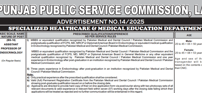 PRESCRIBED QUALIFICATION/EXPERIENCE AS PER SERVICE RULES | i) MBBS or equivalent qualification recognized by Pakistan Medical and Dental Council / Pakistan Medical Commission and postgraduate qualification of FCPS, MD, MRCPor Diplomat American Board in Endocrinology or equivalent medical qualification in Endocrinology recognized by Pakistan Medical and Dental Council / Pakistan Medical Commission; OR MBBS or equivalent qualification recognized by Pakistan Medical and Dental Council / Pakistan Medical Commission and the postgraduate qualification of FCPS, MD, MRCP or Diplomat American Board in General Medicine or any other equivalent medical qualification recognized by Pakistan Medical and Dental Council / Pakistan Medical Commission and one year experience in Endocrinology after post-graduation in an institution recognized by Pakistan Medical and Dental Council / Pakistan Medical Commission; and ii) Three years experience in Endocrinology after post-graduation in an institution recognized by Pakistan Medical and Dental Council / Pakistan Medical Commission. Note: a) Only practical experience after the prescribed qualification shall be considered. b) Valid (full) Permanent Registration Certificate from the Pakistan Medical and Dental Council / Pakistan Medical Commission showing post-graduate qualification issued on or before the closing date. c) Applicants are directed to provide hard copy of their on-line application form via post/courier along with two photocopy sets of all relevant documents & valid experience in relevant field within seven (07) working days after the closing date failing which their applications will be treated as rejected and no further communication will be entertained in this regard |