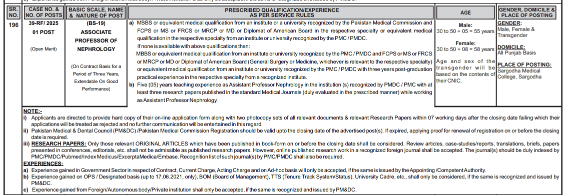 (BS-19)ASSOCIATEPROFESSOR OFNEPHROLOGY(On Contract Basis for aPeriod of Three Years,Extendable On GoodPerformance) BY PPSC 2025