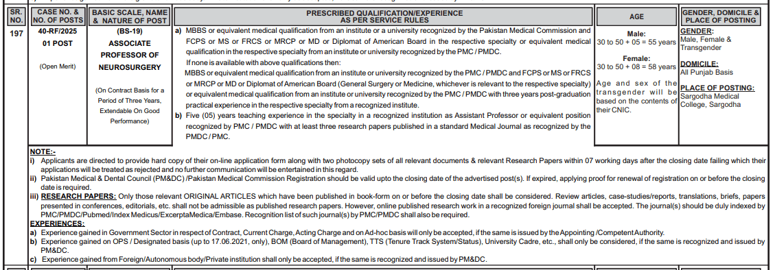 BASIC SCALE, NAME & NATURE OF POST | (BS-19) ASSOCIATE PROFESSOR OF NEUROSURGERY (On Contract Basis for a Period of Three Years, Extendable On Good Performance) |
