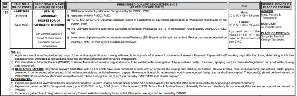 PRESCRIBED QUALIFICATION/EXPERIENCE AS PER SERVICE RULES | i) MBBS or equivalent qualification recognized by the PMDC / PMC; ii) registered with the PMDC / PMC; iii) FCPS, MD, MRCPCH, Diplomat American Board in Paediatrics or equivalent qualification in Paediatrics recognized by the PMDC / PMC; iv) five (05) years’ teaching experience as Assistant Professor Paediatrics (BS-18) in an institution recognized by the PMDC / PMC; and v) three research papers published as an Assistant Professor (BS-18) and published in a standard Medical Journals recognized by the PMDC / PMC or the Higher Education Commission. |