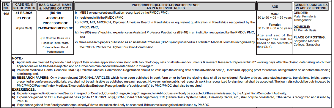 BASIC SCALE, NAME & NATURE OF POST | (BS-19) ASSOCIATE PROFESSOR OF PAEDIATRIC MEDICINE (On Contract Basis for s Period of Three Years, Extendable on Good Performance) |