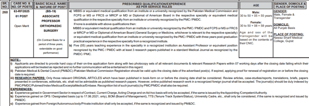 GENDER, DOMICILE & PLACE OF POSTING | GENDER: Male, Female & Transgender DOMICILE: All Punjab Basis PLACE OF POSTING: Nawaz Sharif Medical College, Gujrat |