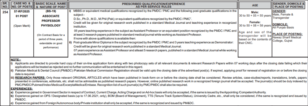 GENDER, DOMICILE & PLACE OF POSTING | GENDER: Male, Female & Transgender DOMICILE: All Punjab Basis PLACE OF POSTING: Nawaz Sharif Medical College, Gujrat |