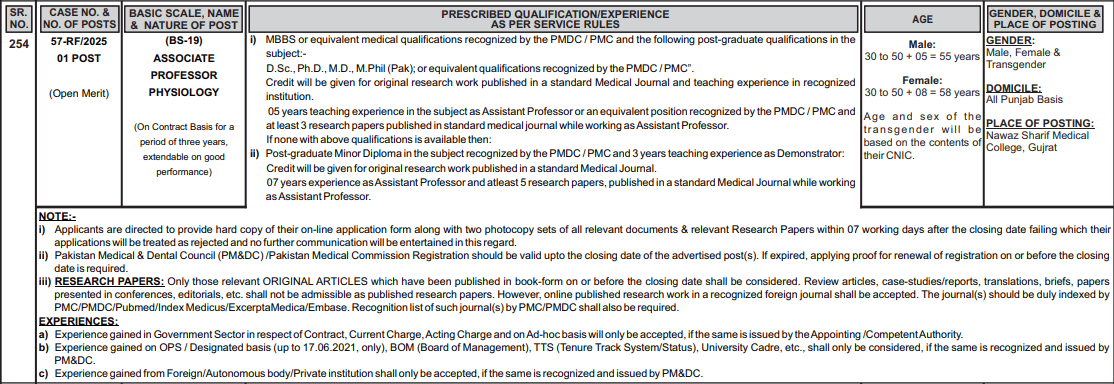 GENDER, DOMICILE & PLACE OF POSTING | GENDER: Male, Female & Transgender DOMICILE: All Punjab Basis PLACE OF POSTING: Nawaz Sharif Medical College, Gujrat |