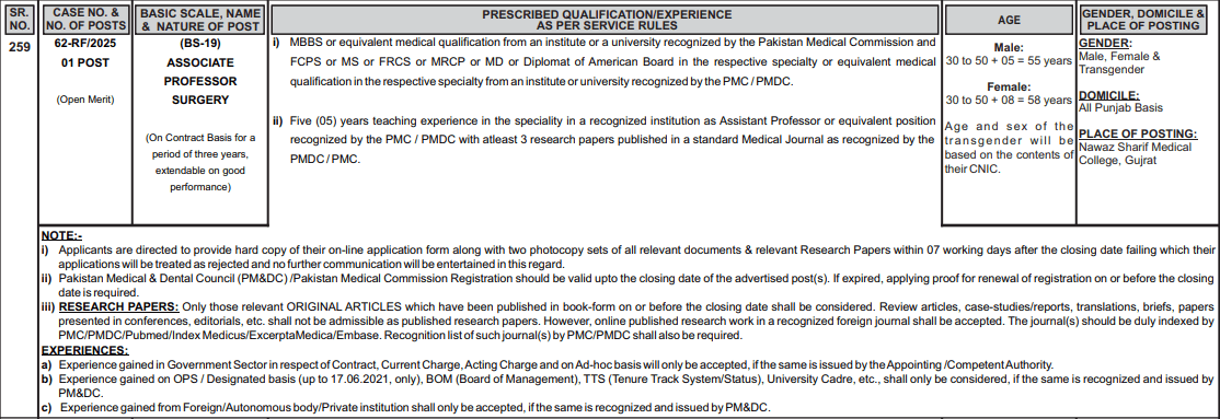 GENDER, DOMICILE & PLACE OF POSTING | GENDER: Male, Female & Transgender DOMICILE: All Punjab Basis PLACE OF POSTING: Nawaz Sharif Medical College, Gujrat |