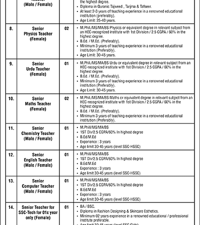 Job Overview Organization Cantt Public Educational Institutes, Cantonment Board Taxila Location Taxila, Punjab Job Type Contract (as per Cantonment Board regulations) Total Posts 28+ Ad Posted DateNew job opportunities 10 May 2025 (As per Nawaiwaqt Newspaper) Last Date to Apply 31 May 2025 Application Mode Online through careers.mlc.gov.pk Vacant Positions and Details Teaching Faculty Post Title No. of Posts Gender Qualification & Requirements Montessori Teachers 02 Female MA/MSc/BS + Montessori Diploma, Age: 25–40 years Junior Teacher – Computer 01 Male/Female BS/MS in CS, 2 years’ teaching experience, Age: 25–40 years Junior Teacher – Maths 01 Female BS Maths, Age: 25–40 years …