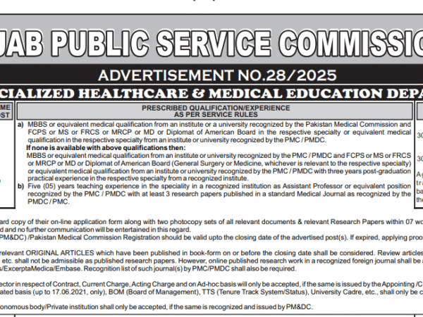 NEW JOBS IN SPECIALIZED HEALTHCARE & MEDICAL EDUCATION DEPARTMENT BY PPSC 2025 APPLY NOW AD NO 2