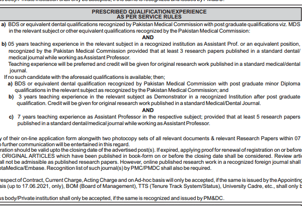 JOBS IN FORMATION 2025 ABOUT AD REQUIRED IMFORMATION CASE NO. &NO. OF POSTS 84-RF/202501 POST(Open Merit) BASIC SCALE, NAME& NATURE OF POST (BS-19)ASSOCIATEPROFESSOROPERATIVEDENTISTRY(On Regular Basis) PRESCRIBED QUALIFICATION/EXPERIENCEAS PER SERVICE RULES i) a) BDS or equivalent dental qualifications recognized by Pakistan Medical Commission with post graduate qualifications viz. MDSin the relevant subject or other equivalent qualifications recognized by the Pakistan Medical Commission:ANDb) 05 years teaching experience in the relevant subject in a recognized institution as Assistant Prof. or an equivalent position,recognized by the Pakistan Medical Commission provided that at least 3 research papers published in a standard dental/medical journal while working …