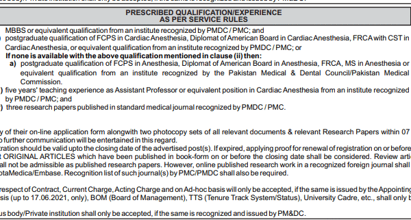 JOBS IN FORMATION 2025 ABOUT AD REQUIRED IMFORMATION CASE NO. &NO. OF POSTS 85-RF/202503 POSTS(Open Merit) BASIC SCALE, NAME& NATURE OF POST (BS-19)ASSOCIATEPROFESSORCARDIAC ANESTHESIA(On Regular Basis) PRESCRIBED QUALIFICATION/EXPERIENCEAS PER SERVICE RULES i) MBBS or equivalent qualification from an institute recognized by PMDC / PMC; andii) postgraduate qualification of FCPS in Cardiac Anesthesia, Diplomat of American Board in Cardiac Anesthesia, FRCAwith CST inCardiac Anesthesia, or equivalent qualification from an institute recognized by PMDC / PMC; orIf none is available with the above qualification mentioned in clause (ii) then:a) postgraduate qualification of FCPS in Anesthesia, Diplomat of American Board in Anesthesia, FRCA, …