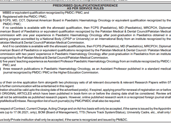JOBS IN FORMATION 2025 ABOUT AD REQUIRED IMFORMATION CASE NO. &NO. OF POSTS 86-RF/202502 POSTS(Open Merit) BASIC SCALE, NAME& NATURE OF POST (BS-19)ASSOCIATEPROFESSORPAEDIATRICHAEMATOLOGYONCOLOGY(On Regular Basis) PRESCRIBED QUALIFICATION/EXPERIENCEAS PER SERVICE RULES i) MBBS or equivalent qualification recognized by PMDC / PMC; andii) Registered with the PMDC / PMC;iii) FCPS, MD, CCT, Diplomat American Board in Paediatric Haematology Oncology or equivalent qualification recognized by thePMDC / PMC;If no candidate is available with the aforesaid qualification, then FCPS (Paediatrics), MD (Paediatrics), MRCPCH, DiplomatAmerican Board of Paediatrics or equivalent qualification recognized by the Pakistan Medical & Dental Council/Pakistan MedicalCommission with one year experience in …