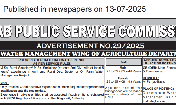 NEW JOBS IN WATER MANAGEMENT WING OF AGRICULTURE DEPARTMENT 2025 BY PPSC APPLY NOW
