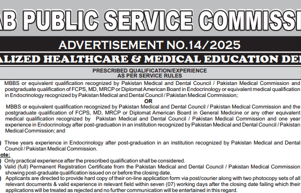 JOBS INFORMATION CASE NO. &NO. OF POSTS 37-RE/202502-POSTS(Open Merit) BASIC SCALE, NAME& NATURE OF POST (BS-18)ASSISTANTPROFESSOR OFENDOCRINOLOGY(On Regular Basis) PRESCRIBED QUALIFICATION/EXPERIENCEAS PER SERVICE RULES i) MBBS or equivalent qualification recognized by Pakistan Medical and Dental Council / Pakistan Medical Commission andpostgraduate qualification of FCPS, MD, MRCPor Diplomat American Board in Endocrinology or equivalent medical qualificationin Endocrinology recognized by Pakistan Medical and Dental Council / Pakistan Medical Commission;ORMBBS or equivalent qualification recognized by Pakistan Medical and Dental Council / Pakistan Medical Commission and thepostgraduate qualification of FCPS, MD, MRCP or Diplomat American Board in General Medicine or any other equivalentmedical qualification …