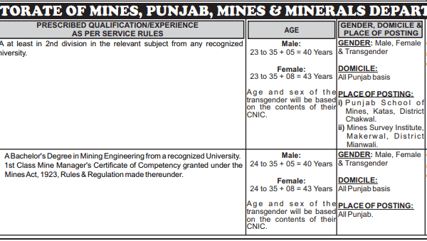 NEW jOBS AS A INSPECTORATE OF MINES, PUNJAB, MINES & MINERALS DEPARTMENT BY PPSC 2025