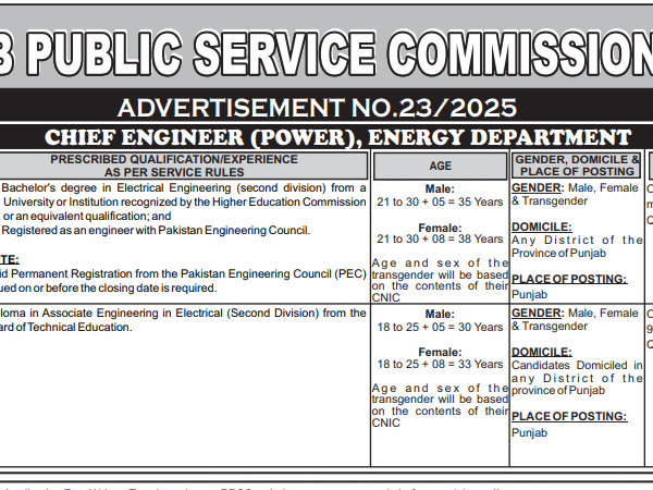 POST INFORMATION CASE NO. &NO. OF POSTS 61-RE/202507–POSTS(Open Merit=06Women Quota=01) BASIC SCALE, NAME& NATURE OF POST (BS-17)Assistant ElectricInspector(On Contract Basis for aperiod of 03 years) PRESCRIBED QUALIFICATION/EXPERIENCEAS PER SERVICE RULES i) Bachelor’s degree in Electrical Engineering (second division) from aUniversity or Institution recognized by the Higher Education Commissionor an equivalent qualification; andii) Registered as an engineer with Pakistan Engineering Council.NOTE:Valid Permanent Registration from the Pakistan Engineering Council (PEC)issued on or before the closing date is required. AGE Male:21 to 30 + 05 = 35 YearsFemale:21 to 30 + 08 = 38 YearsA g e a n d s e x …