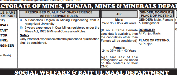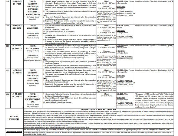 POST INFORMATION CASE NO. &NO. OF POSTS 61-RE/202507–POSTS(Open Merit=06Women Quota=01) BASIC SCALE, NAME& NATURE OF POST (BS-17)Assistant ElectricInspector(On Contract Basis for aperiod of 03 years) PRESCRIBED QUALIFICATION/EXPERIENCEAS PER SERVICE RULES i) Bachelor’s degree in Electrical Engineering (second division) from aUniversity or Institution recognized by the Higher Education Commissionor an equivalent qualification; andii) Registered as an engineer with Pakistan Engineering Council.NOTE:Valid Permanent Registration from the Pakistan Engineering Council (PEC)issued on or before the closing date is required. AGE Male:21 to 30 + 05 = 35 YearsFemale:21 to 30 + 08 = 38 YearsA g e a n d s e x …
