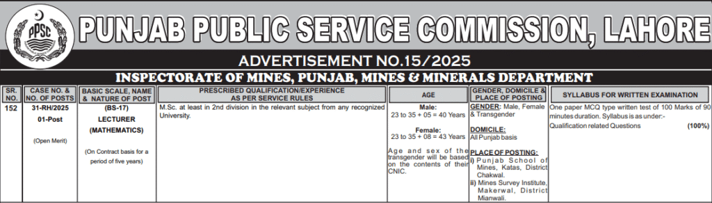 BASIC SCALE, NAME & NATURE OF POST | (BS-17) LECTURER (MATHEMATICS) (On Contract basis for a period of five years) |