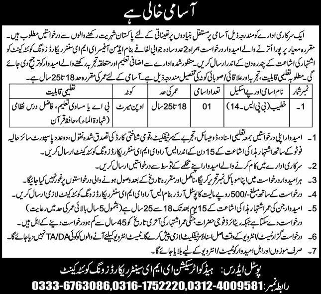 1 | Khateeb (BPS-14) | 01 | 18 to 25 years | Open Merit | D.A. or equivalent qualification, Dars-e-Nizami (Shahadat-ul-Aalamia), Hafiz-e-Quran |