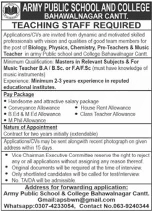 Looking to begin or elevate your teaching career in a prestigious academic institution? Army Public School & College jobs in Bahawalnagar April 2025 bring a golden opportunity for passionate educators to join a disciplined and rewarding environment. The school is currently inviting applications for teaching positions in Biology, Physics, Chemistry, Pre-Teachers, and Music. With an attractive salary package, allowances, and a secure contract-based position, this is an ideal job for qualified teachers seeking stability and professional growth in Bahawalnagar Cantt.