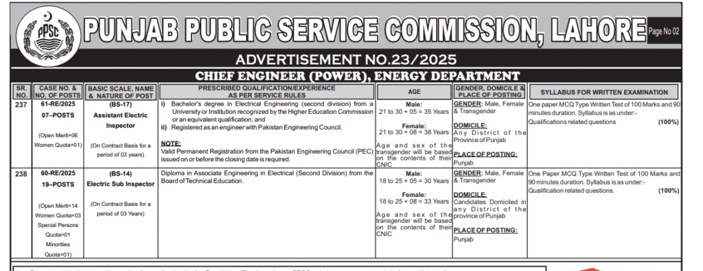 BASIC SCALE, NAME & NATURE OF POST | (BS-14) Electric Sub Inspector (On Contract Basis for a period of 03 Years) |