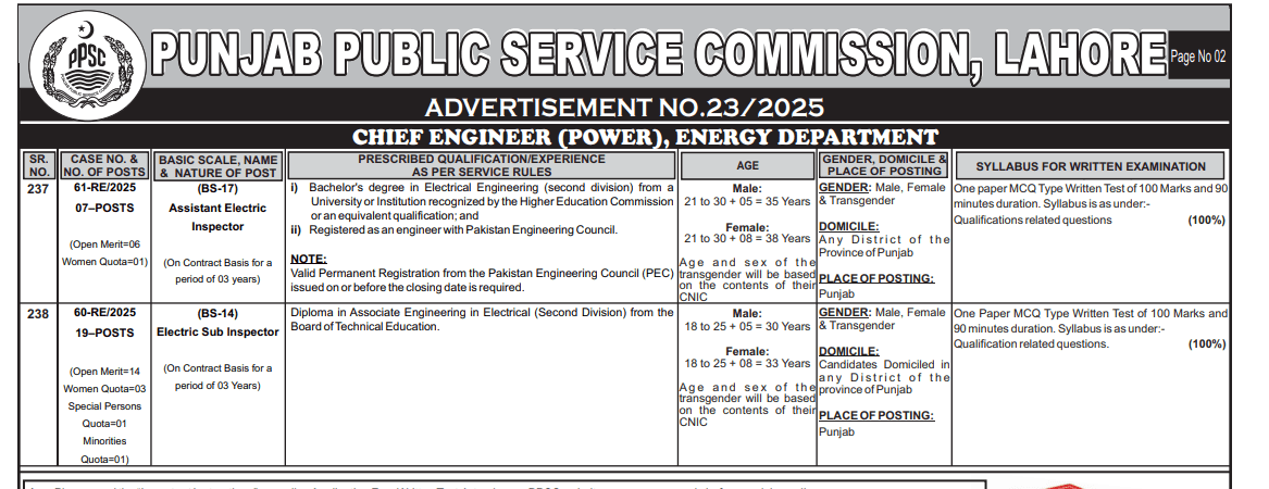 PRESCRIBED QUALIFICATION/EXPERIENCE AS PER SERVICE RULES | i) Bachelor’s degree in Electrical Engineering (second division) from a University or Institution recognized by the Higher Education Commission or an equivalent qualification; and ii) Registered as an engineer with Pakistan Engineering Council. NOTE: Valid Permanent Registration from the Pakistan Engineering Council (PEC) issued on or before the closing date is required. |