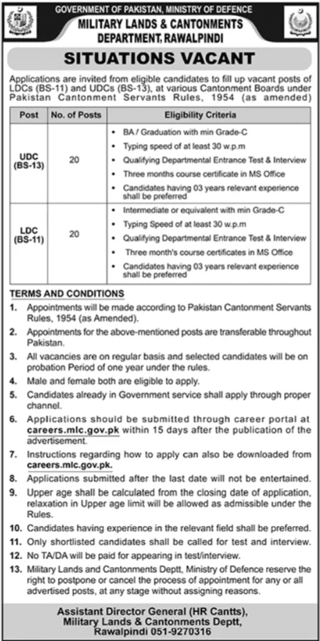 The Government of Pakistan’s Ministry of Defence has officially announced the latest Military Lands And Cantonment Department Jobs May 2025. Eligible candidates are invited to apply for 40 vacant posts of Upper Division Clerk (UDC, BS-13) and Lower Division Clerk (LDC, BS-11) across various Cantonment Boards under the Pakistan Cantonment Servants Rules, 1954 (as amended). These are excellent government job opportunities for candidates with typing skills, relevant education, and clerical experience. Preference will be given to those with prior relevant experience and MS Office certification. The positions are transferrable across Pakistan and come with a one-year probation period.