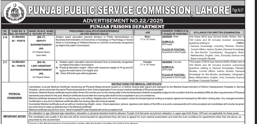 NEW JOBS IN PUNJAB PRISONS DEPARTMENT 2025 BY PPSC APPLY NOW