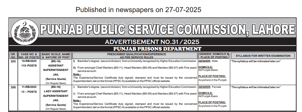 - Positions Advertised:Assistant Superintendent Jail (Male) and Lady Assistant Superintendent Jail (Female), both BS-16, on a service quota basis.