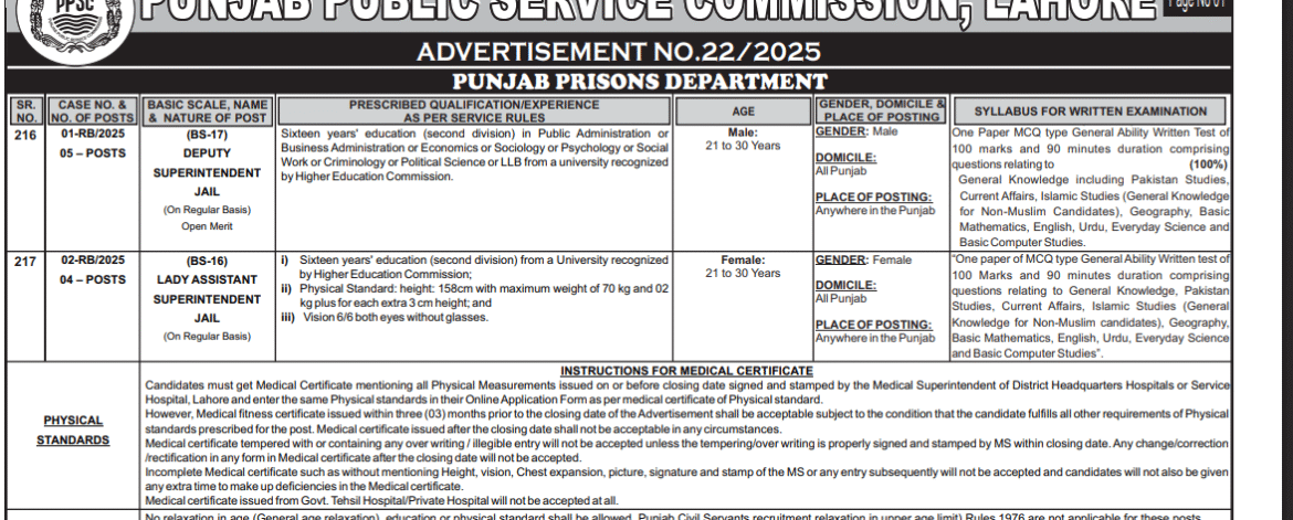 NEW JOBS IN PUNJAB PRISONS DEPARTMENT 2025 BY PPSC APPLY NOW