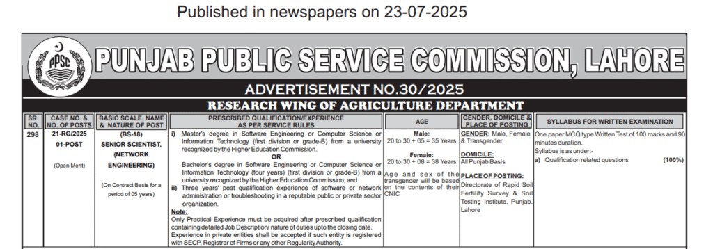 BASIC SCALE, NAME & NATURE OF POST | (BS-18) SENIOR SCIENTIST, (NETWORK ENGINEERING) (On Contract Basis for a period of 05 years) |