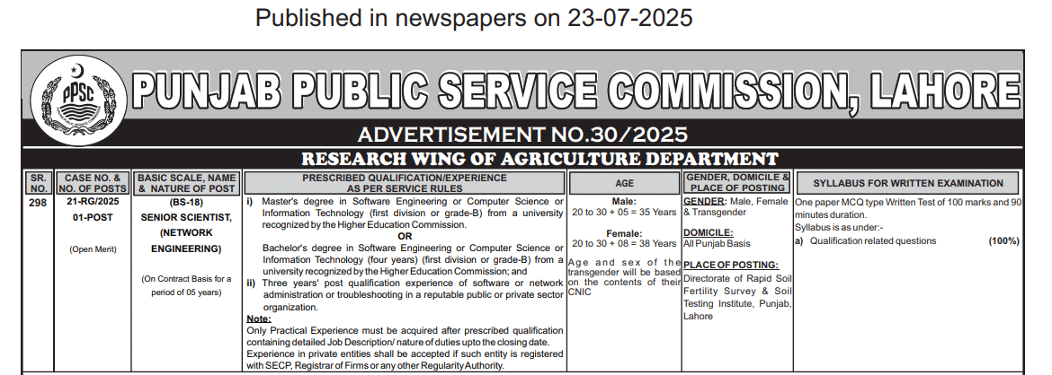 BASIC SCALE, NAME & NATURE OF POST | (BS-18) SENIOR SCIENTIST, (NETWORK ENGINEERING) (On Contract Basis for a period of 05 years) |