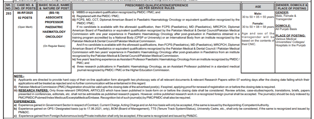 PRESCRIBED QUALIFICATION/EXPERIENCE AS PER SERVICE RULES | i) MBBS or equivalent qualification recognized by PMDC / PMC; and ii) Registered with the PMDC / PMC; iii) FCPS, MD, CCT, Diplomat American Board in Paediatric Haematology Oncology or equivalent qualification recognized by the PMDC / PMC; If no candidate is available with the aforesaid qualification, then FCPS (Paediatrics), MD (Paediatrics), MRCPCH, Diplomat American Board of Paediatrics or equivalent qualification recognized by the Pakistan Medical & Dental Council/Pakistan Medical Commission with one year experience in Paediatric Haematology Oncology after post-graduation in Paediatrics obtained in a training program accredited by a National Body (CPSP or University) or an International Body from an institute recognized by the Pakistan Medical & Dental Council/Pakistan Medical Commission. And if no candidate is available with the aforesaid qualifications, then FCPS (Paediatrics), MD (Paediatrics), MRCPCH, Diplomat American Board of Paediatrics or equivalent qualifications recognized by the Pakistan Medical & Dental Council / Pakistan Medical Commission with two years’ experience in Paediatric Haematology Oncology after post-graduation in Paediatrics from an institute recognized by the Pakistan Medical & Dental Council/Pakistan Medical Commission. iv) five years’ teaching experience as Assistant Professor Paediatric Haematology Oncology from an institute recognized by PMDC / PMC; and v) three research publications in Paediatric Haematology Oncology, as an Assistant Professor published in a standard medical journal recognized by PMDC / PMC or the Higher Education Commission. |