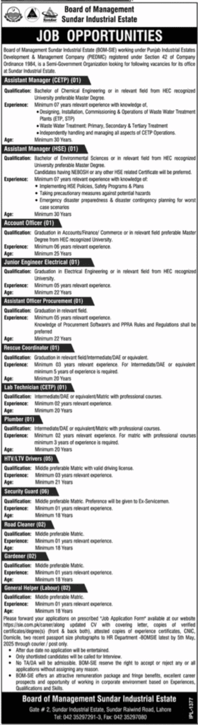 Sundar Industrial Estate Jobs in Punjab April 2025 have been officially announced by the Board of Management, BOM-SIE. This semi-government body is hiring for various technical, administrative, and labor positions at its office in Lahore. From Assistant Managers to Drivers, Security, and Lab Technicians – there’s something for professionals at every level. Interested candidates must apply using the prescribed form by 05 May 2025. These roles offer competitive benefits and career progression in a semi-corporate setup.