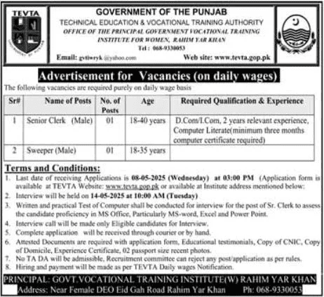 The Technical Education & Vocational Training Authority (TEVTA) has announced new employment opportunities in Punjab on a daily wage basis. If you’re seeking a short-term yet valuable work opportunity in a reputable government institute, this could be the right fit for you. These TEVTA Jobs in Punjab April 2025 are open to male candidates who meet the qualification and age criteria. The positions are offered at the Government Vocational Training Institute for Women, Rahim Yar Khan, with a simple application process and clear terms.