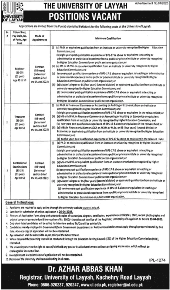 University of Layyah Jobs in Punjab April 2025 has been advertised in Dunya newspaper. The University of Layyah invites applications from eligible, Punjab-domiciled candidates for top-tier administrative roles on a contract basis (03 years). The vacant positions include Registrar (BS-19), Treasurer (BS-19), and Controller of Examinations (BS-19), each with an age limit of 40 to 50 years. Apply online before April 26, 2025 for these latest jobs in Pakistan.