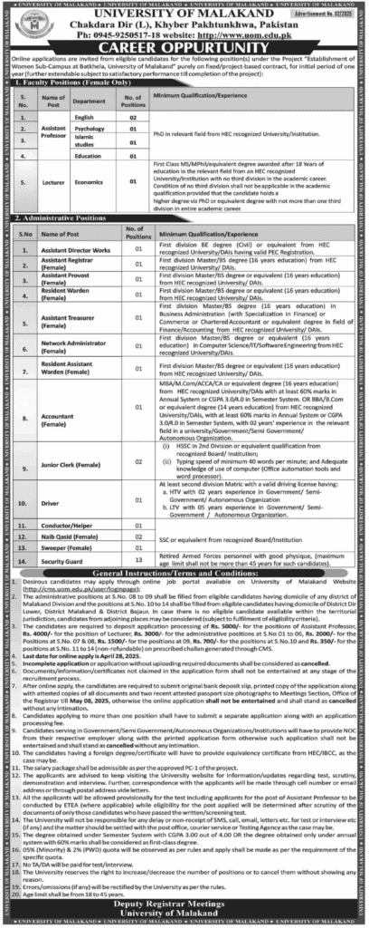 Looking for teaching and administrative positions in Khyber Pakhtunkhwa? University of Malakand Jobs in Khyber Pakhtunkhwa April 2025 Online Apply portal is now open for eligible candidates under the project “Establishment of Women Sub-Campus at Batkhela.” Vacancies include Assistant Professors, Lecturers, and various administrative roles such as Assistant Registrar, Accountant, Junior Clerk, and more—primarily for female candidates. These are fixed/project-based contract positions with a one-year term, extendable on performance. Applicants from Malakand Division, Dir Lower, and Bajaur are encouraged to apply online through the University’s portal by April 28, 2025, and submit documents by May 8, 2025. Full details, eligibility criteria, and fee structure are available on www.uom.edu.pk. Don’t miss this opportunity to join one of Khyber Pakhtunkhwa’s leading public universities.