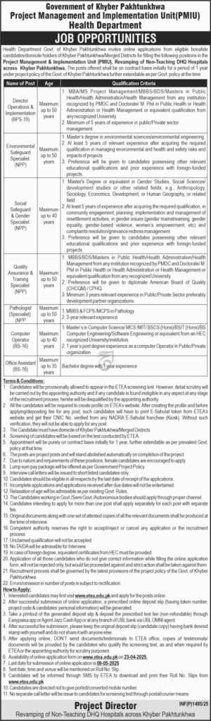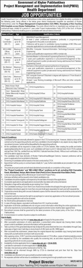 Looking for new career opportunities in the public sector? The Project Management & Implementation Unit (PMIU) under the Health Department Government of Khyber Pakhtunkhwa is hiring qualified individuals across various disciplines. This is your chance to contribute to the Revamping of Non-Teaching DHQ Hospitals across KPK on a contract basis (initially for 1 year, extendable). If you have experience in health administration, public health, gender studies, IT, or project implementation, these roles could be perfect for you. Make sure to apply via the ETEA platform before the deadline and be part of this impactful healthcare transformation. Don’t miss this golden opportunity in KPK’s government sector!