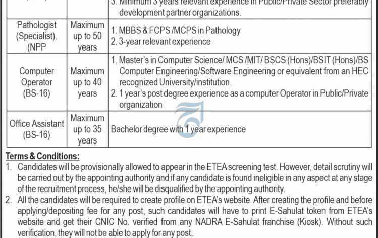 Looking for new career opportunities in the public sector? The Project Management & Implementation Unit (PMIU) under the Health Department Government of Khyber Pakhtunkhwa is hiring qualified individuals across various disciplines. This is your chance to contribute to the Revamping of Non-Teaching DHQ Hospitals across KPK on a contract basis (initially for 1 year, extendable). If you have experience in health administration, public health, gender studies, IT, or project implementation, these roles could be perfect for you. Make sure to apply via the ETEA platform before the deadline and be part of this impactful healthcare transformation. Don’t miss this golden opportunity in KPK’s government sector!