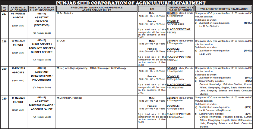 PUNJAB SEED CORPORATION OF AGRICULTURE DEPARTMENT BY PPSC 2025