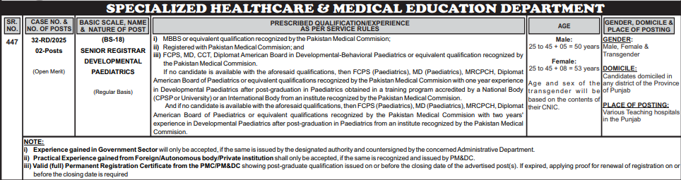 | PRESCRIBED QUALIFICATION/EXPERIENCE AS PER SERVICE RULES | i) MBBS or equivalent qualification recognized by the Pakistan Medical Commision; ii) Registered with Pakistan Medical Commision; and iii) FCPS, MD, CCT, Diplomat American Board in Developmental-Behavioral Paediatrics or equivalent qualification recognized by the Pakistan Medical Commision. If no candidate is available with the aforesaid qualifications, then FCPS (Paediatrics), MD (Paediatrics), MRCPCH, Diplomat American Board of Paediatrics or equivalent qualifications recognized by the Pakistan Medical Commision with one year experience in Developmental Paediatrics after post-graduation in Paediatrics obtained in a training program accredited by a National Body (CPSPor University) or an International Body from an institute recognized by the Pakistan Medical Commision. And if no candidate is available with the aforesaid qualifications, then FCPS (Paediatrics), MD (Paediatrics), MRCPCH, Diplomat American Board of Paediatrics or equivalent qualifications recognized by the Pakistan Medical Commision with two years’ experience in Developmental Paediatrics after post-graduation in Paediatrics from an institute recognized by the Pakistan Medical Commision. |
