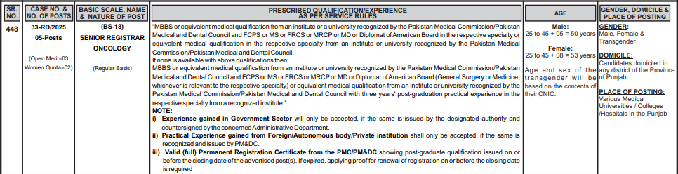 | GENDER, DOMICILE & PLACE OF POSTING | GENDER: Male, Female & Transgender DOMICILE: Candidates domiciled in any district of the Province of Punjab PLACE OF POSTING: Various Medical Universities / Colleges Hospitals in the Punjab |