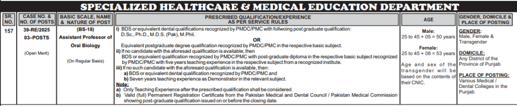 GENDER, DOMICILE & PLACE OF POSTING | GENDER: Male, Female & Transgender DOMICILE: Any District of the Province of Punjab PLACE OF POSTING: Various Medical / Dental Colleges in the Punjab |