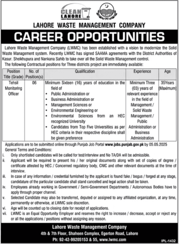 Exciting opportunities await in the public sector! The Lahore Waste Management Company has announced Tehsil Monitoring Officer LWMC Jobs April 2025 across three districts. If you have a strong background in public or business administration, management, or environmental sciences, this is your chance to contribute to modernizing solid waste management in Punjab. LWMC is looking for experienced professionals who are passionate about bringing sustainable improvements to municipal services. Apply now on these new jobs 2025 and be part of the team transforming waste management in Kasur, Sheikhupura, and Nankana Sahib!