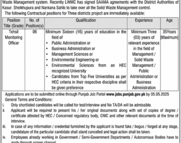 Exciting opportunities await in the public sector! The Lahore Waste Management Company has announced Tehsil Monitoring Officer LWMC Jobs April 2025 across three districts. If you have a strong background in public or business administration, management, or environmental sciences, this is your chance to contribute to modernizing solid waste management in Punjab. LWMC is looking for experienced professionals who are passionate about bringing sustainable improvements to municipal services. Apply now on these new jobs 2025 and be part of the team transforming waste management in Kasur, Sheikhupura, and Nankana Sahib!
